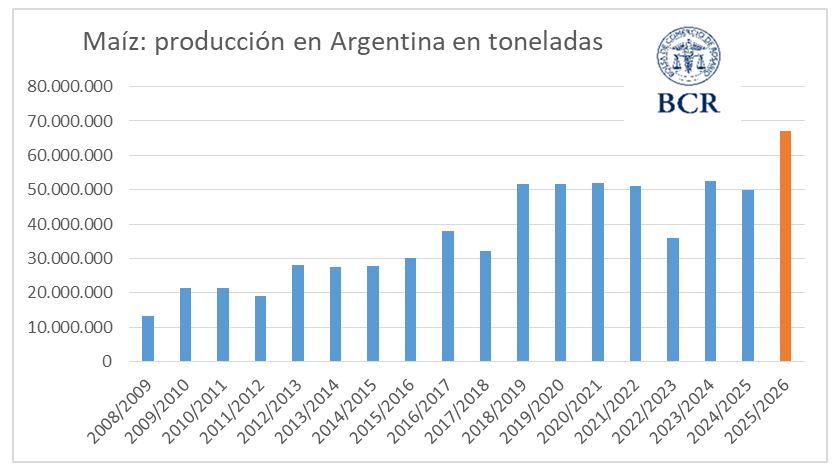 La Bolsa de Comercio de Rosario ajustó tanto la superficie como los rendimientos proyectados de maíz argentino 2025/26 para estimar ahora una cosecha nacional total de 67 millones de toneladas, u...